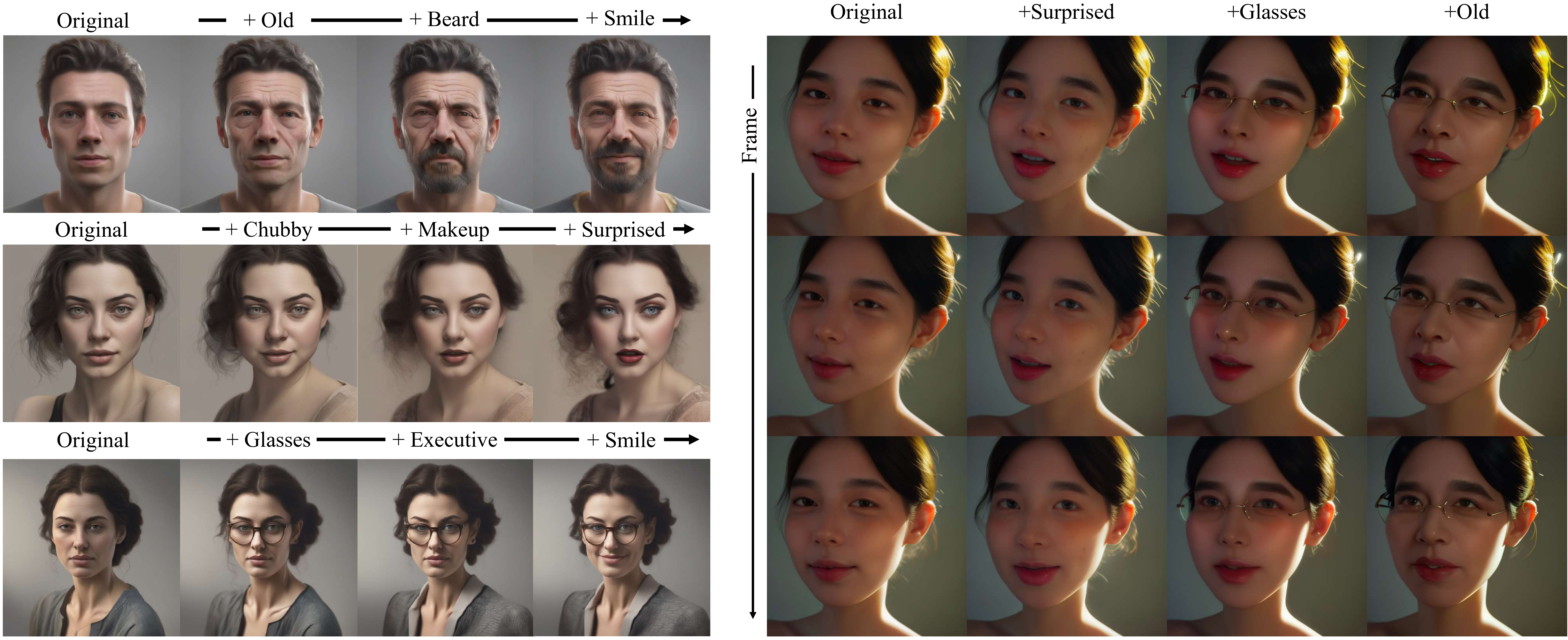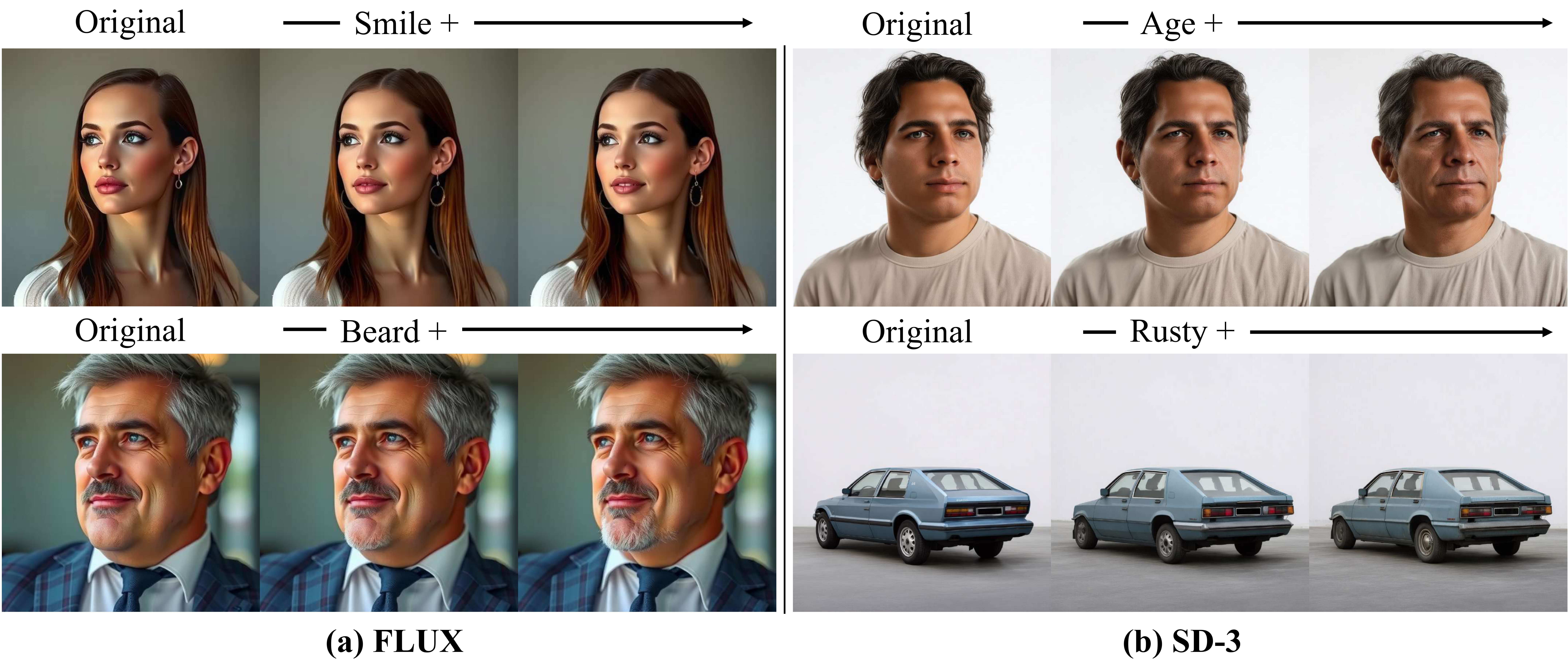 We demonstrate the composability of Text Slider in both text-to-image (left) and text-to-video (right) generation by sequentially manipulating different attributes. The proposed approach preserves structural consistency while enabling fine-grained control over the target concepts at each editing stage.